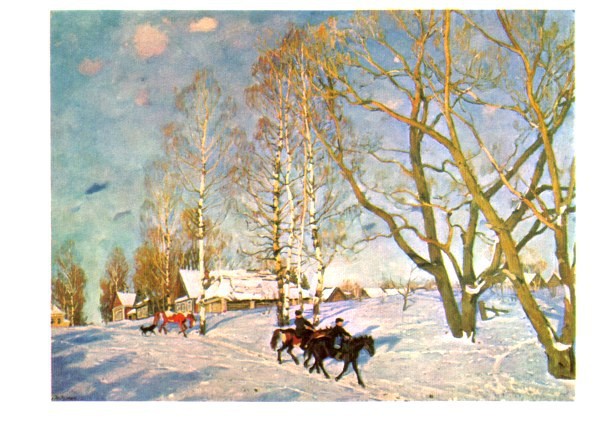 Ясная погода, почти полдень. На улице еще лежит снег, но уже чувствуется приход весны, светит яркое солнце, в честь которого и названа картина. На переднем плане я вижу несколько ребятишек, которые скачут на лошадях. Мальчишки совсем маленькие, под ними такие же небольшие лошади, как и они. Но они гордой и уверенной поступью движутся вперед. Следом за ними идет рыжая корова и собака, черный пес играет с любопытством с молодой коровой. За ними остается деревня, дома, крыши которых закутаны в снежные шарфы. Кроме ребят и животных на улице больше никого невидно.