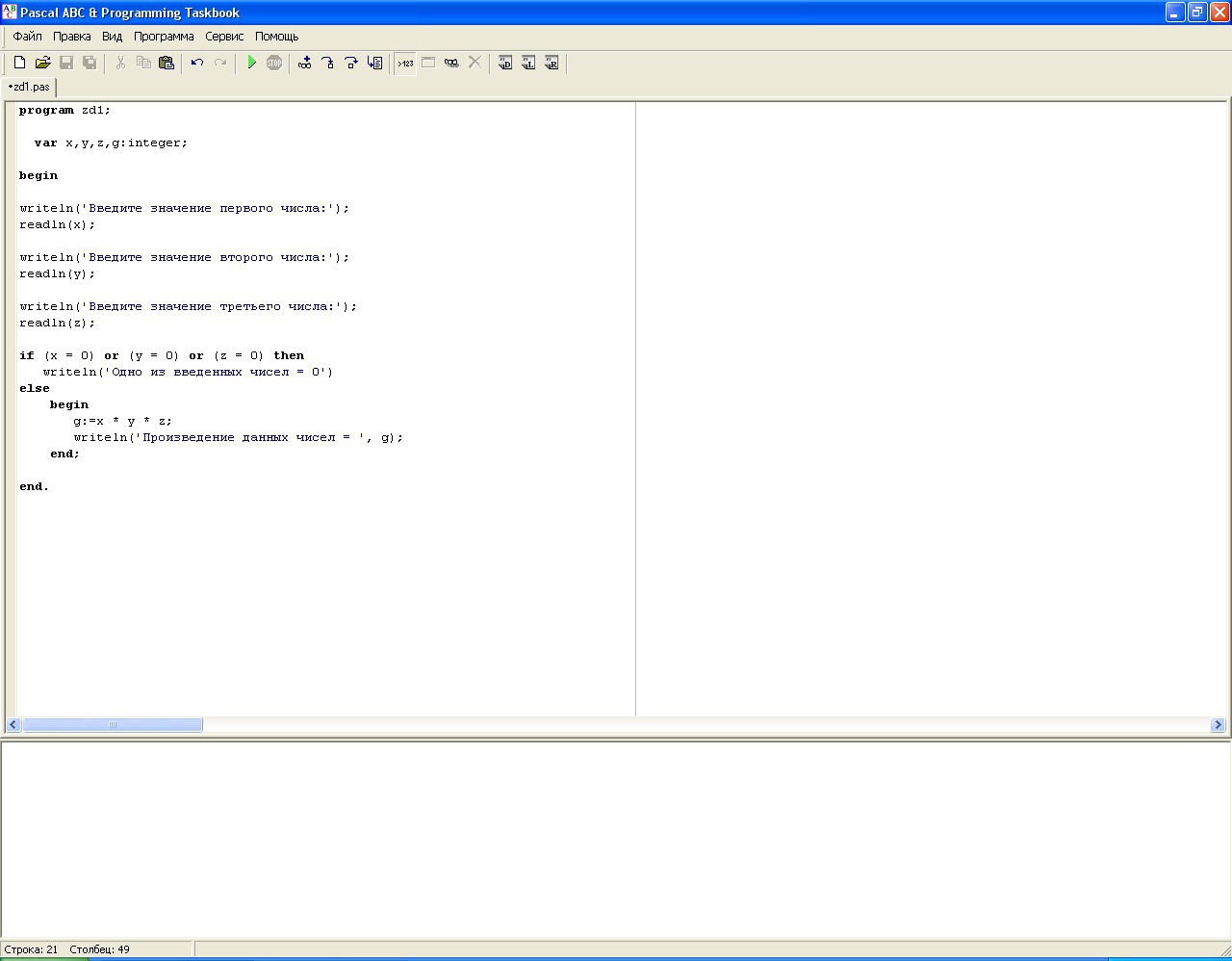 даны три числа.Если среди нет нулей, то вычислить и вывести произведение этих чисел