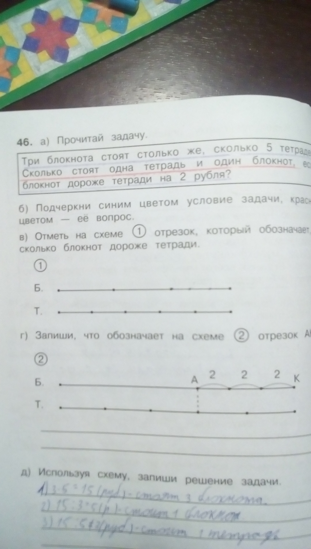 ну на В отметить, на сколько блокнот дороже тетради, в Г отрезок АК означает, что на 2+2+2 рубля можно купить 2 тетради.