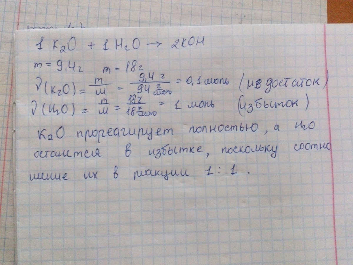 Для рекции K2O+H2O=2KOH взяли K20 массой 9,4 г и воду массой 18 г.Полностью ли прореагирубт взятые вещества?