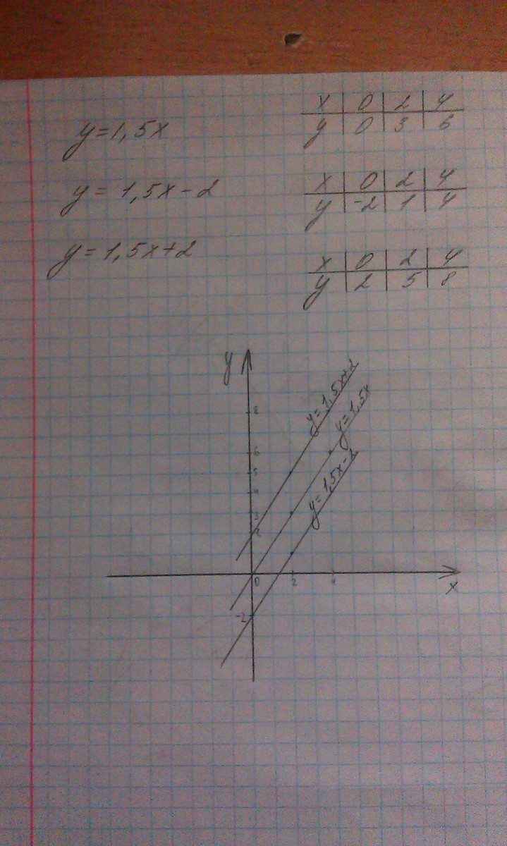 в одной системе координат постройте графики функций : y=1,5x ; y=1,5x-2 : y=1,5x+2