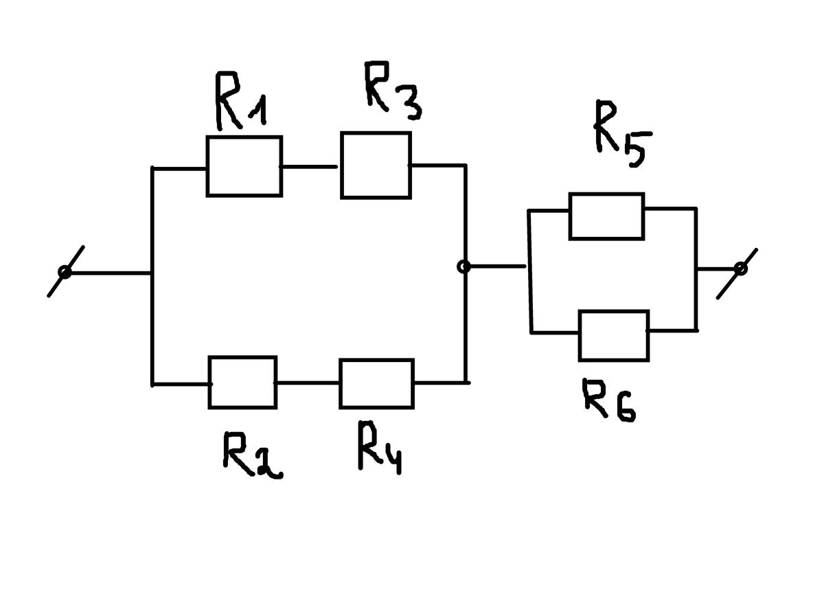 Определить общее сопротивление цепи R1=10, R2=20, R3=50, R4=20, R5=12, R6=16