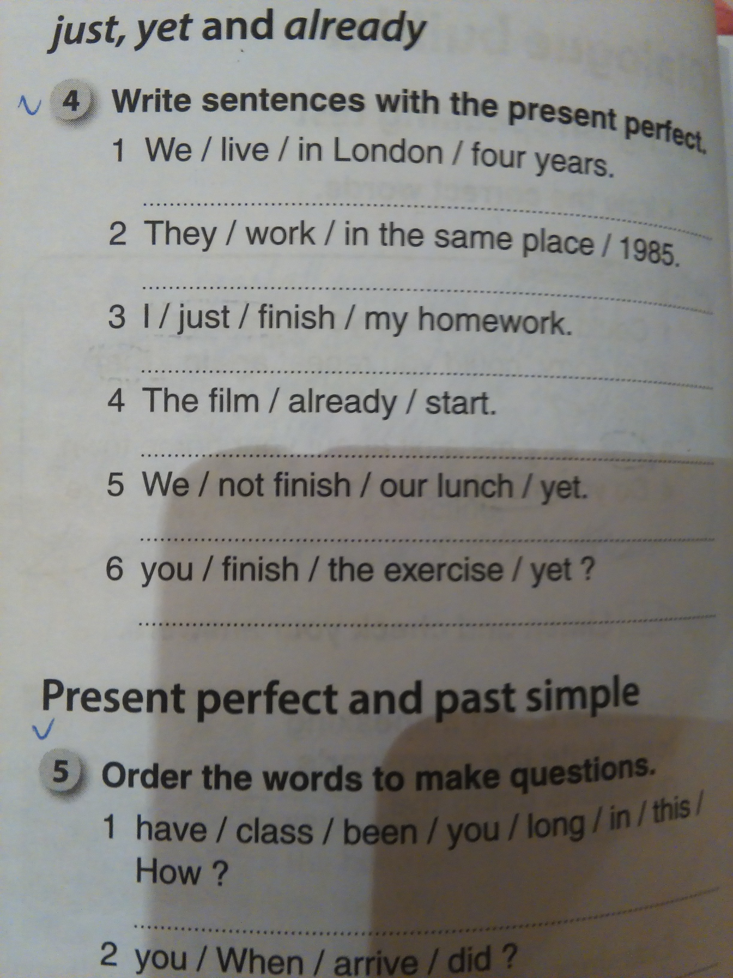 We have lived In London for four years. They have worked in the same place since 1985. I just have finished my homework. The film has already started. We have not finished our lunch yet.
