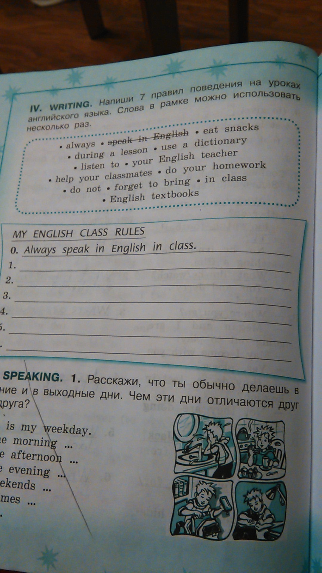 Always listen to your English teacher. Always do your homework. Don't eat snacks during the lesson. Always help your classmates. Don't forget to bring English textbooks. Always use a dictionary.