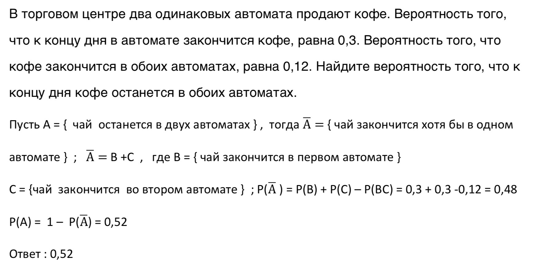 В торговом центре два одинаковых автомата продают кофе. Вероятность того, что к концу дня в автомате закончится кофе, равна 0,3. Вероятность того, что кофе закончится в обоих автоматах, равна 0,12. Найдите вероятность того, что к концу дня кофе останется в обоих автоматах.