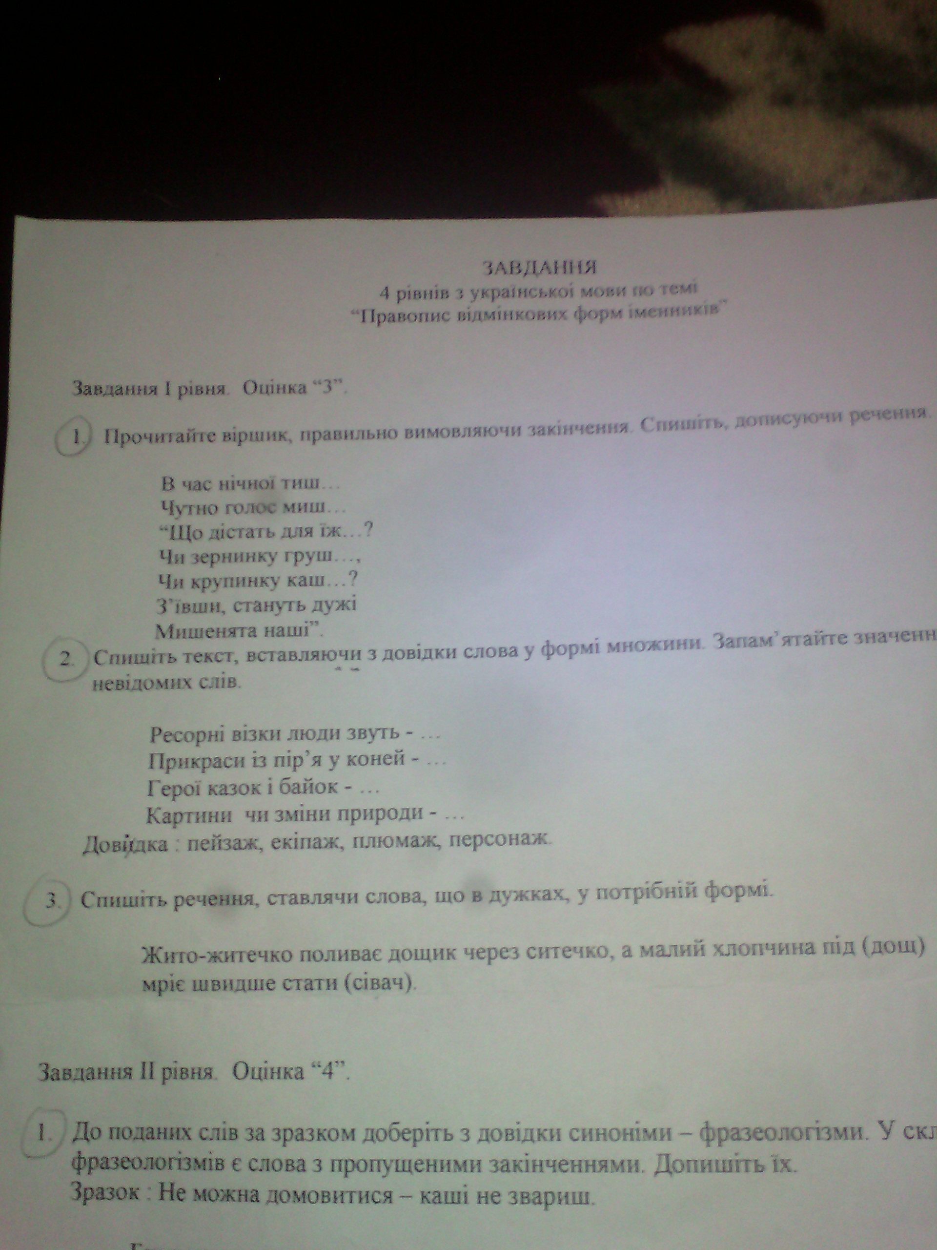 В час нічної тиші,чутно голос миші : Що дістать для їжі? Чи зернининку груші, чи крупинку каші? З'їв ши стануть дужі, мишенята наші. 2) 1-екіпаж 2-плюмаж, 3-персонаж, 4- пейзаж. 3) під дощем, сівачем.