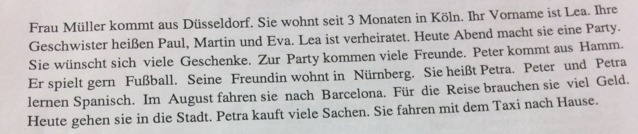 Госпожа Мюллер прибыла из Дюссельдорфа. Она живет так 3 месяца в Кёльне. Её имя Леа. Её братьев и сестру зовут Пауль, Мартин и Ева. Леа замужем. Сегодня она устраивает (делает) вечеринку. Она желает много подарков. На вечеринку приходят много друзей. Петер прибыл из Хамма. Он охотно играет в футбол. Его подруга живет в Нюрнберге. Её зовут Петра. Петер и Петра учат испанский. В августе они едут в Барселону. Для путешествия они нуждаются в деньгах. Сегодня они идут в город. Петра покупает много вещей. Они едут домой на такси.