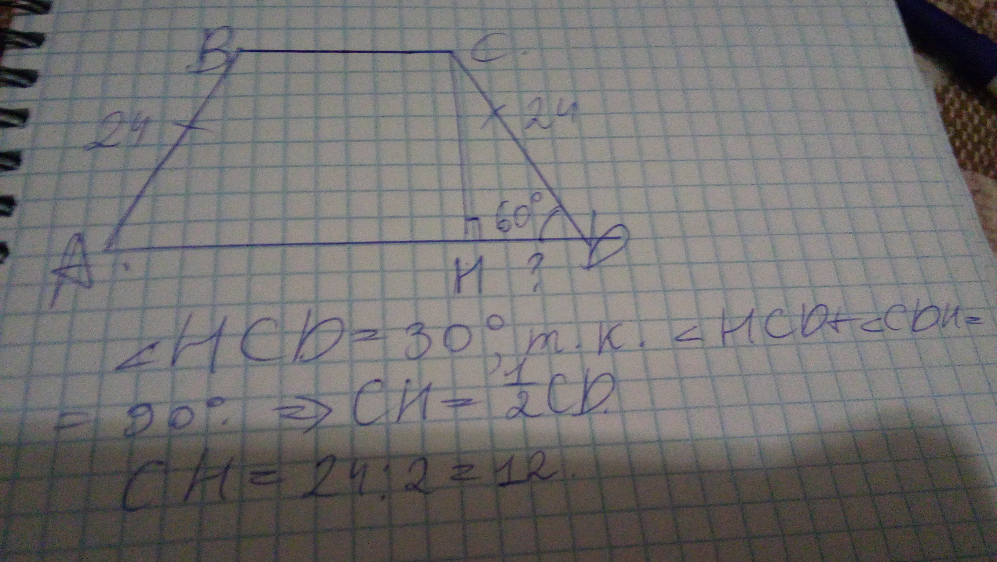 Боковая сторона CD равнобедренной трапеции ABCD равна 24, угол ADC=60. В трапеции проведена высота CH. Найдите длину отрезка Dh.Очеень надо!