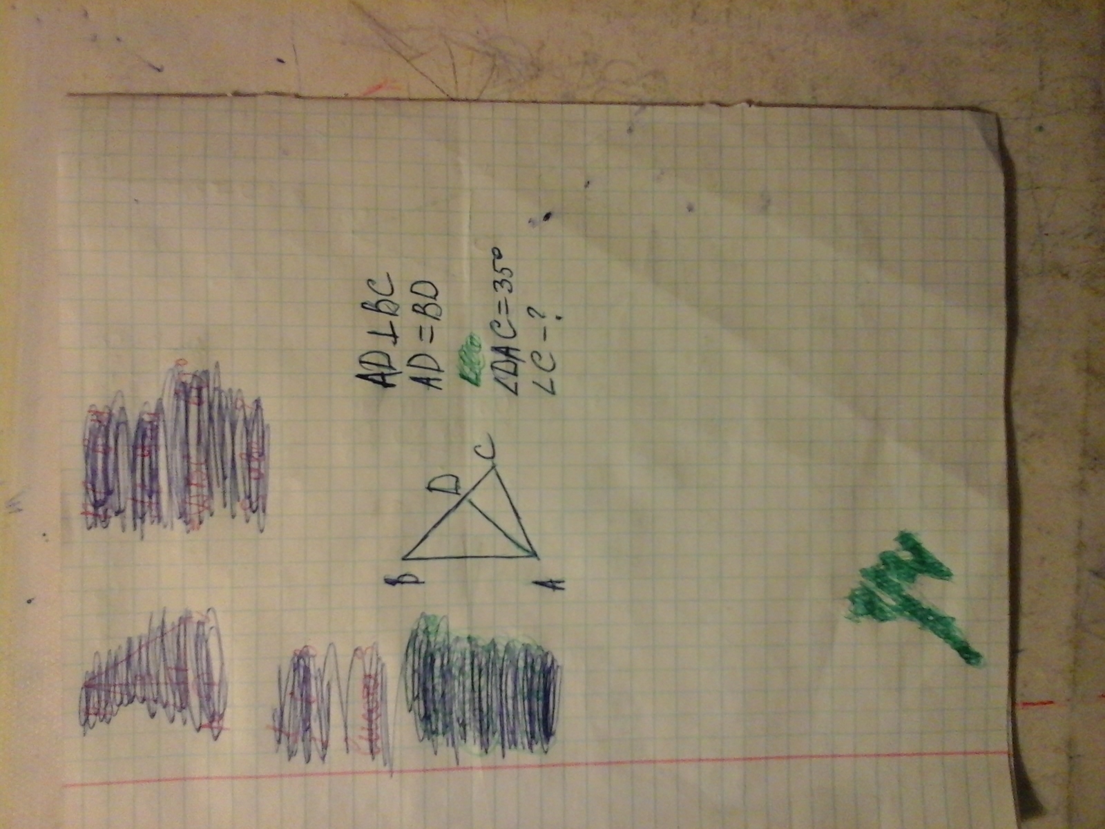 треугольник DAC прямоугольный. А в прямоугольном треугольнике один угол всегда равен 90 градусов. В нашем случае угол D. равен 90. А общая сумма углов треугольника равна 180 . Получается,что бы найти угол С нужно 180-90-35=55 .