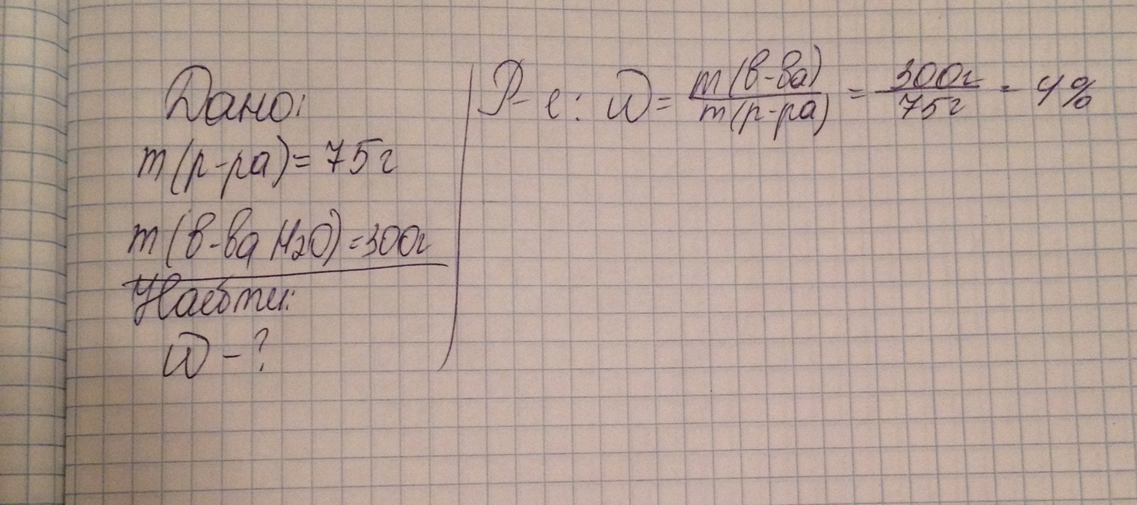 определите массовую долю вещества в растворе, если расмвор содержит вещество, массой 75г и воду массой 300г.