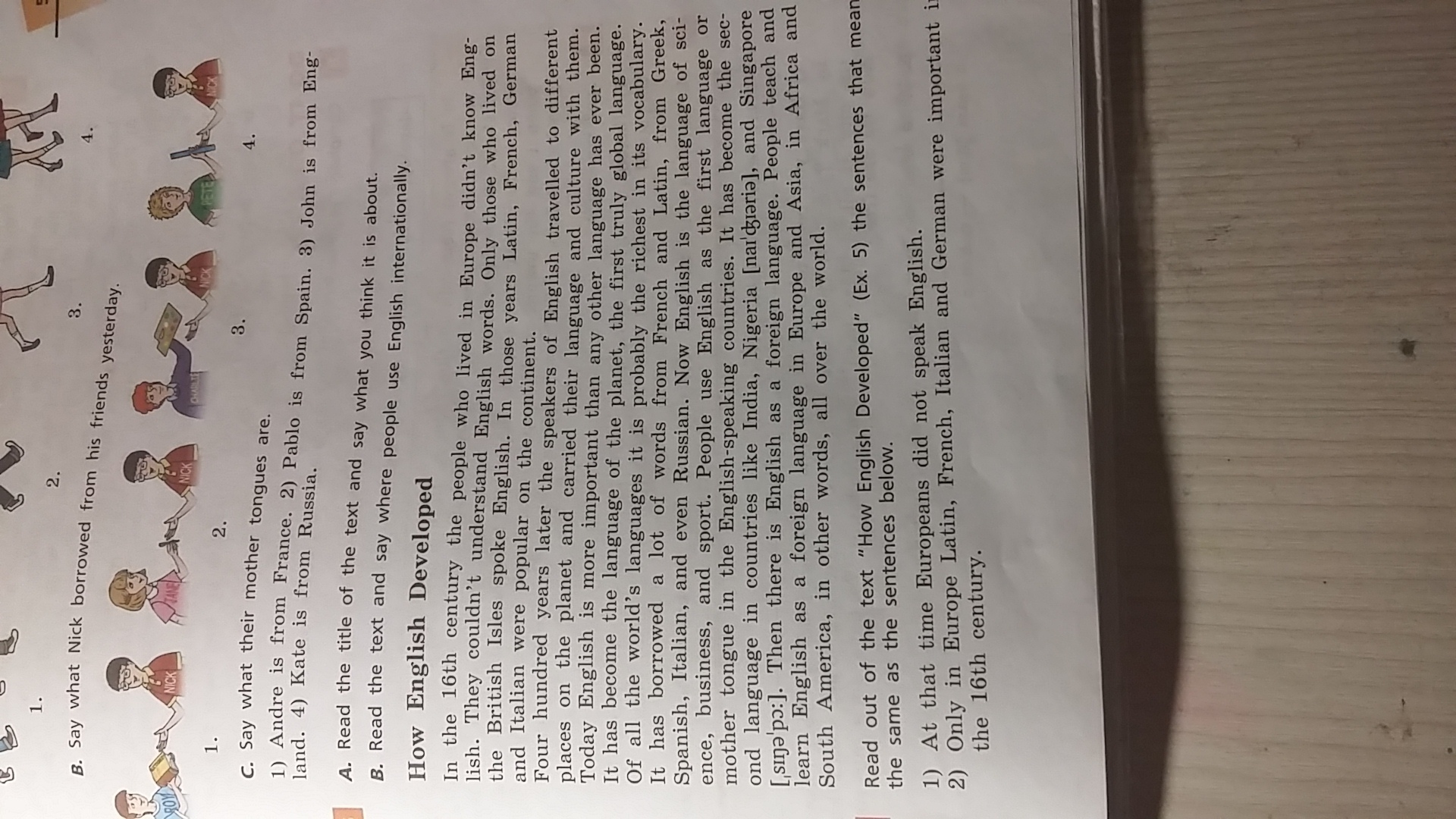 В 16 веке люди которые жили в Европе не знали английского языка. Они не понимали английских слов. Только те кто жил на британских островах разговаривали по английски. В те годы латинский, француский, немецкий и италианский языки были популярными на континенте. Через четыреста лет говорящие на английском путишевствовали в разные места планеты и распространяли свой язык и свою культуру. На сегодня английский язык очень важный чем любой другой язык. Он стал языком планеты, первый настоящий всемирный язык. Из всех языков мира, он наверное имеет самое великое количество слов. Он позаимствовал много слов с французкого и латинского языков, с греческого, испанского, итальянского, и даже с русского. Сейчас английский язык для науки, бизнеса и спорта. Люди говорят на английском в качестве первого языка или родного языка в англоязычных странах. Он стал вторым языком в таких странах как Индия, Нигерия и Сингапур. Там английский как иностранный язык. Люди учат и изучают английский как иностранный язык в Европе, Азии, в Африке и Южной Америке, иными словами - во всём мире.