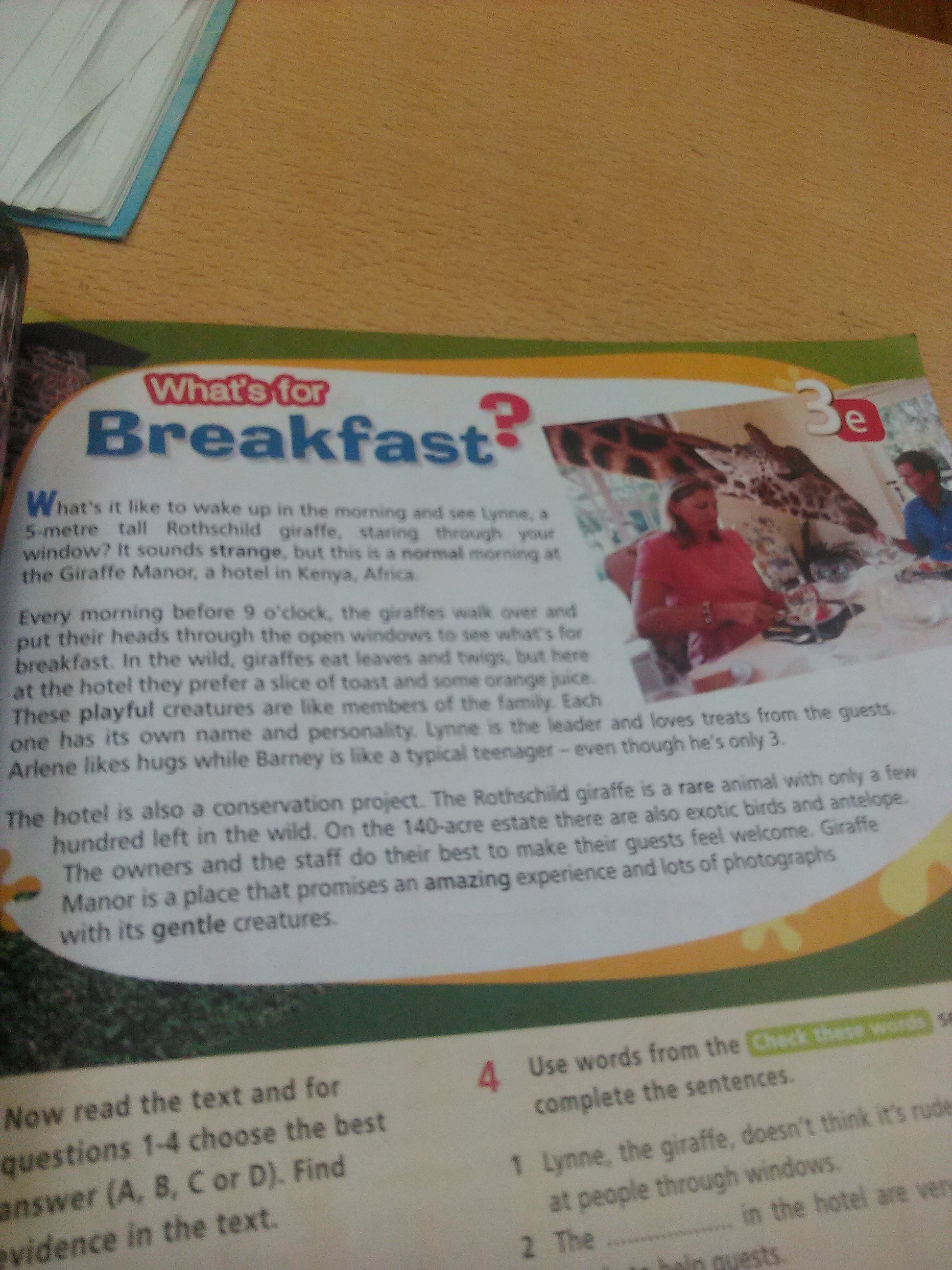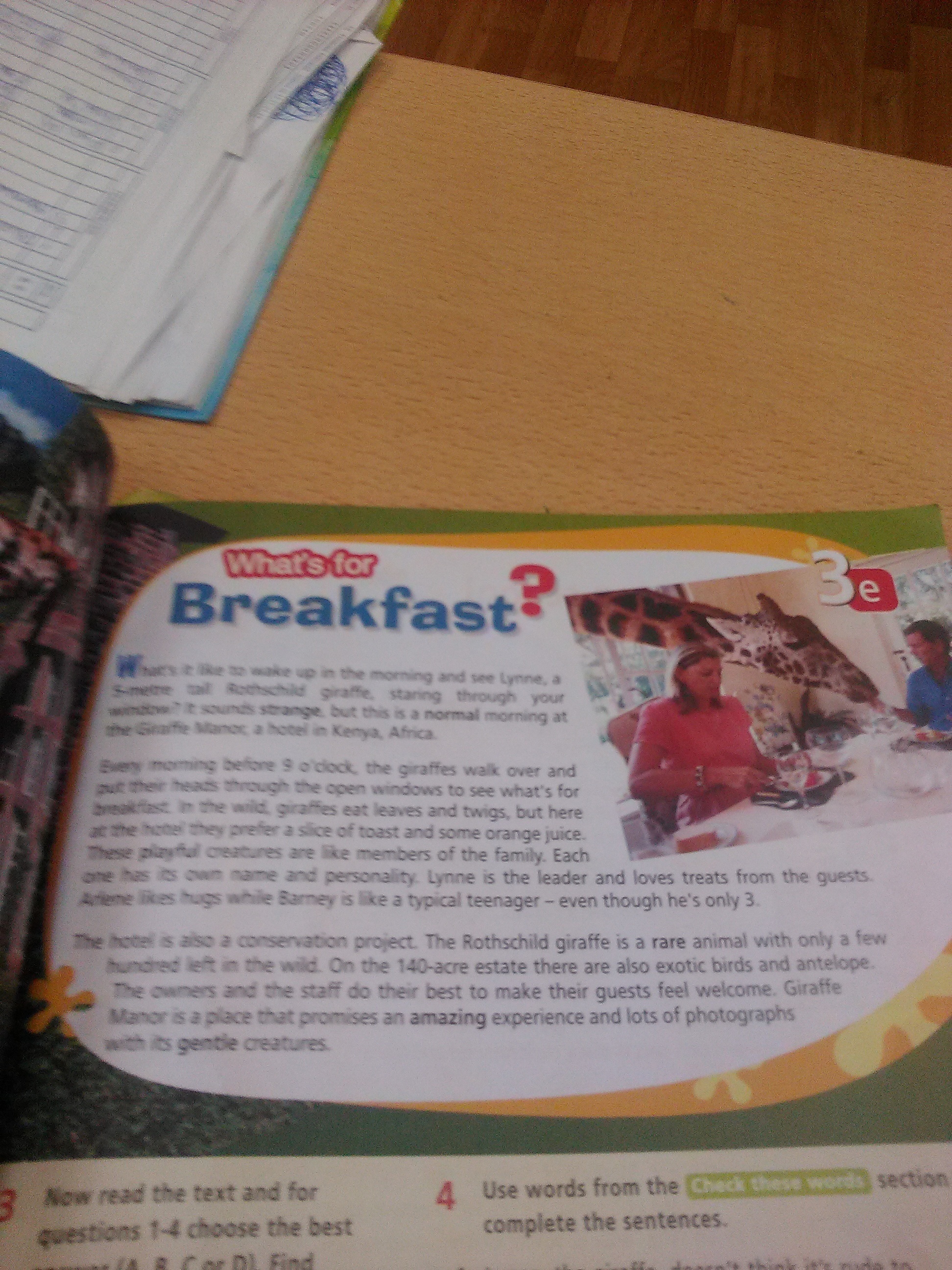 Каждое утро, примерно в 9 часов, жирафы подходят к окнам и суют туда голову и смотрят что едят на завтрак люди. В природе жирафы жуют ветки и листья, но тут они едят тосты и другое. Они любят играть, как будто члены семьи. У каждого есть свое имя. Люна (ХЗ) глава всех жирафов и она любит угощения от гостей.