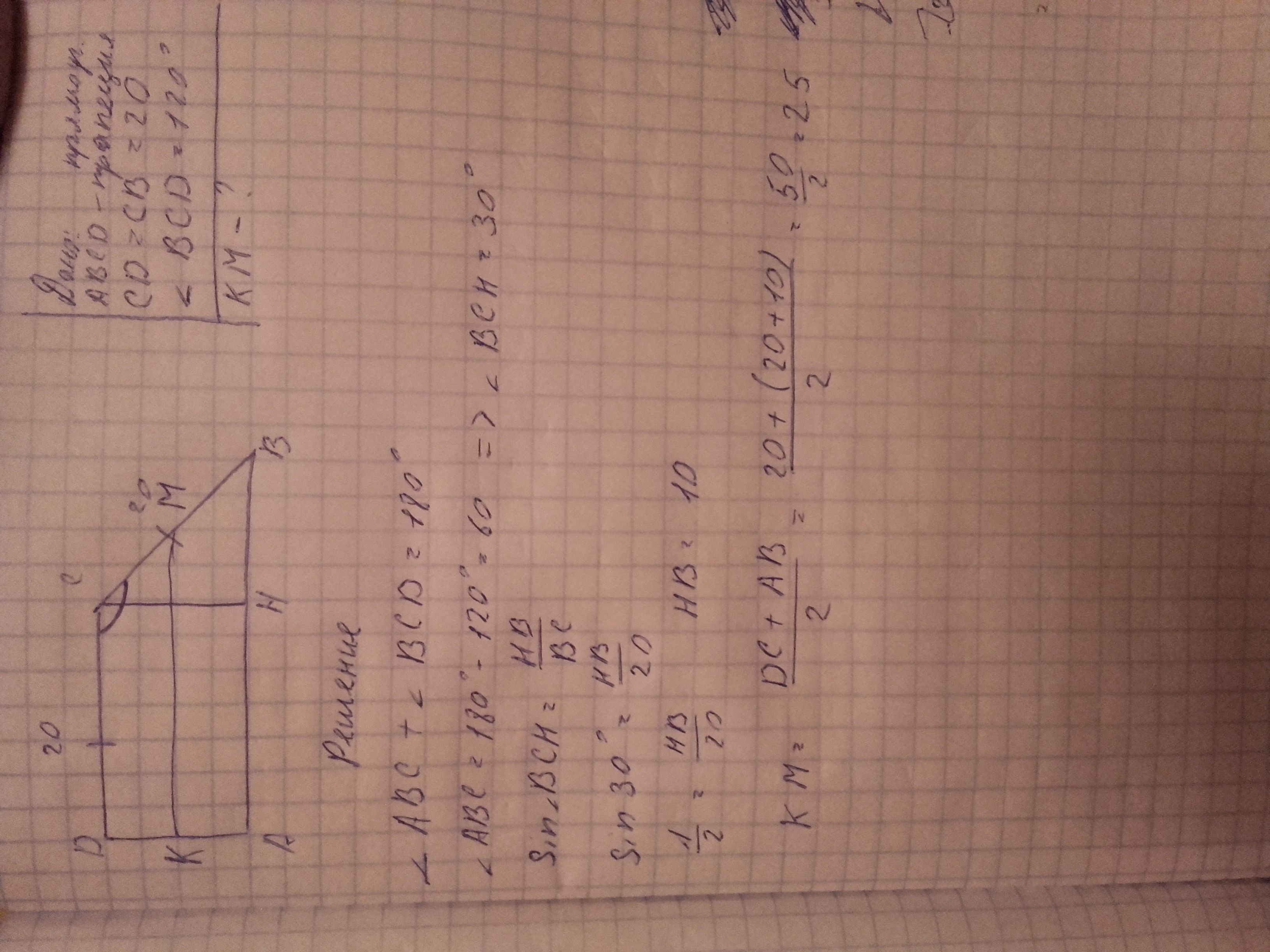Меньше основание трапеции конгруэнтно больший из непераллельных сторон. Найдите длину средней линии, если длина меньшего основагия равна 20 см