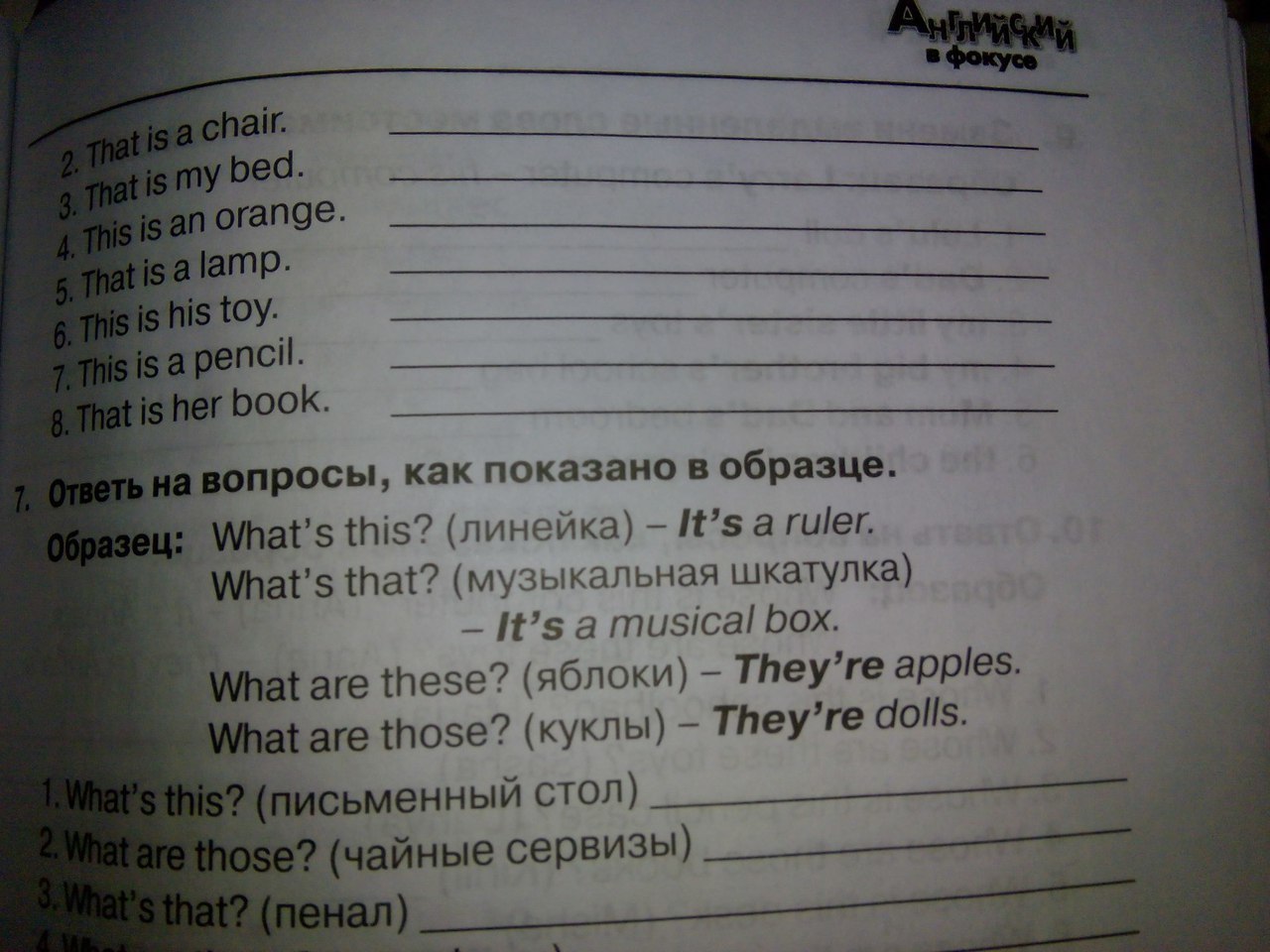7. В этом упражнении нужно написать ответ на поставленный вопрос. Смотря на структуру предложения мы будем определять число и расстояние от нас данных предметов. Его можно определить по тем же местоимениям "This", "That", "These" и "Those":