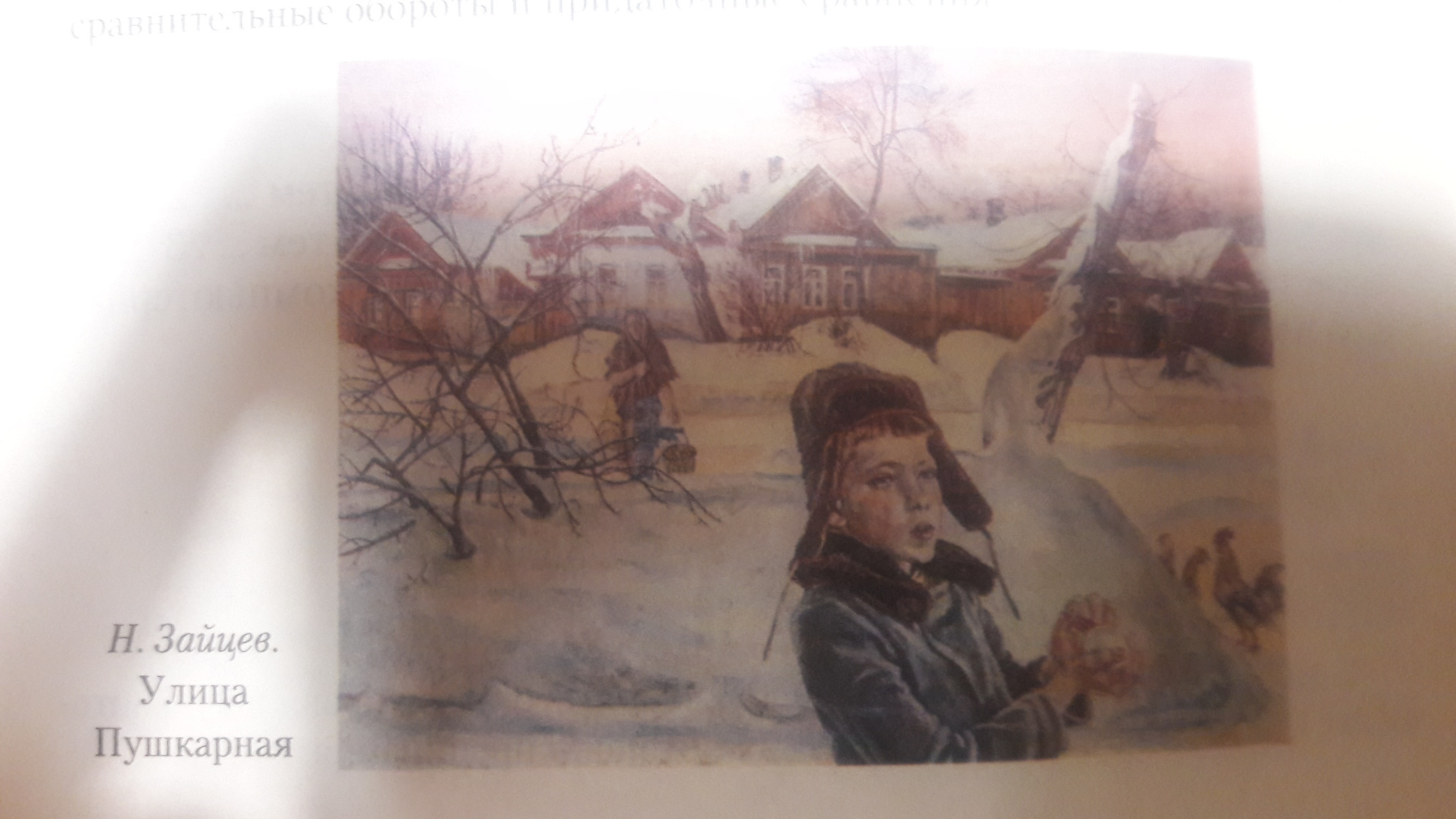 Опишите репродукцию Е.Зайцева "Улица Пушкарная " 5-6 предложениями , используя сравнительные обороты и придаточные сравнения .