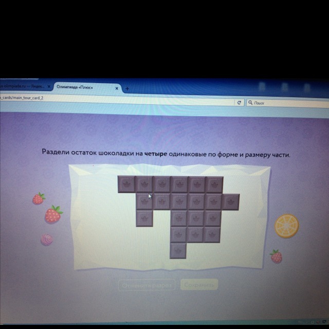 Раздели остаток шоколадки на четыре одинаковые по форме и размеру части, буду благодарна!)