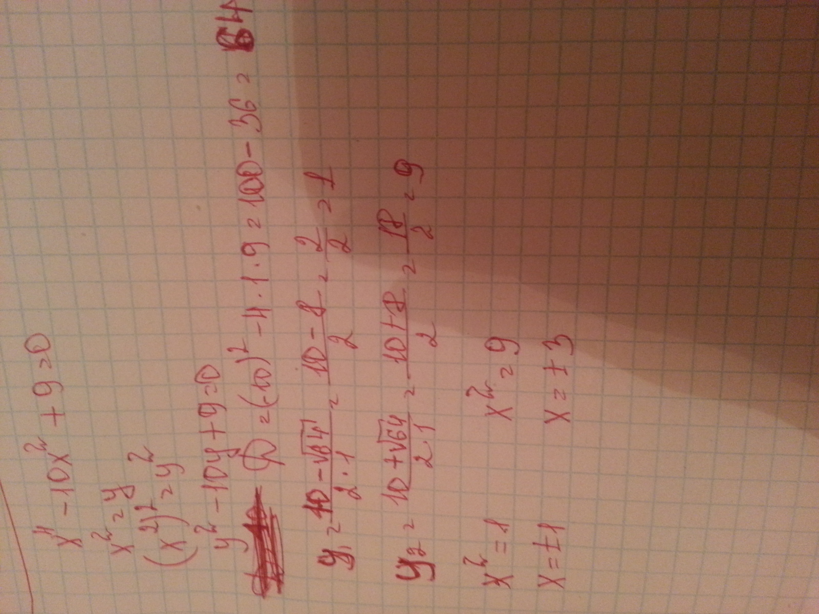 х в 4 степени - 10х в квадрате + 9 = 0. Решите пожалуйста очень подробно