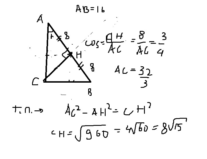 В треугольнике abc угол c=90,ch-высота, ab=16,cosA=3/4.Найдите AH.