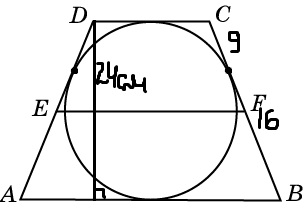 В равнобедренную трапецию вписана окружность. Точка касания делит боковую сторону в отношении 9:16, высота трапеции равна 24 см. Найдите среднюю линию трапеции. (Cм. влож.)