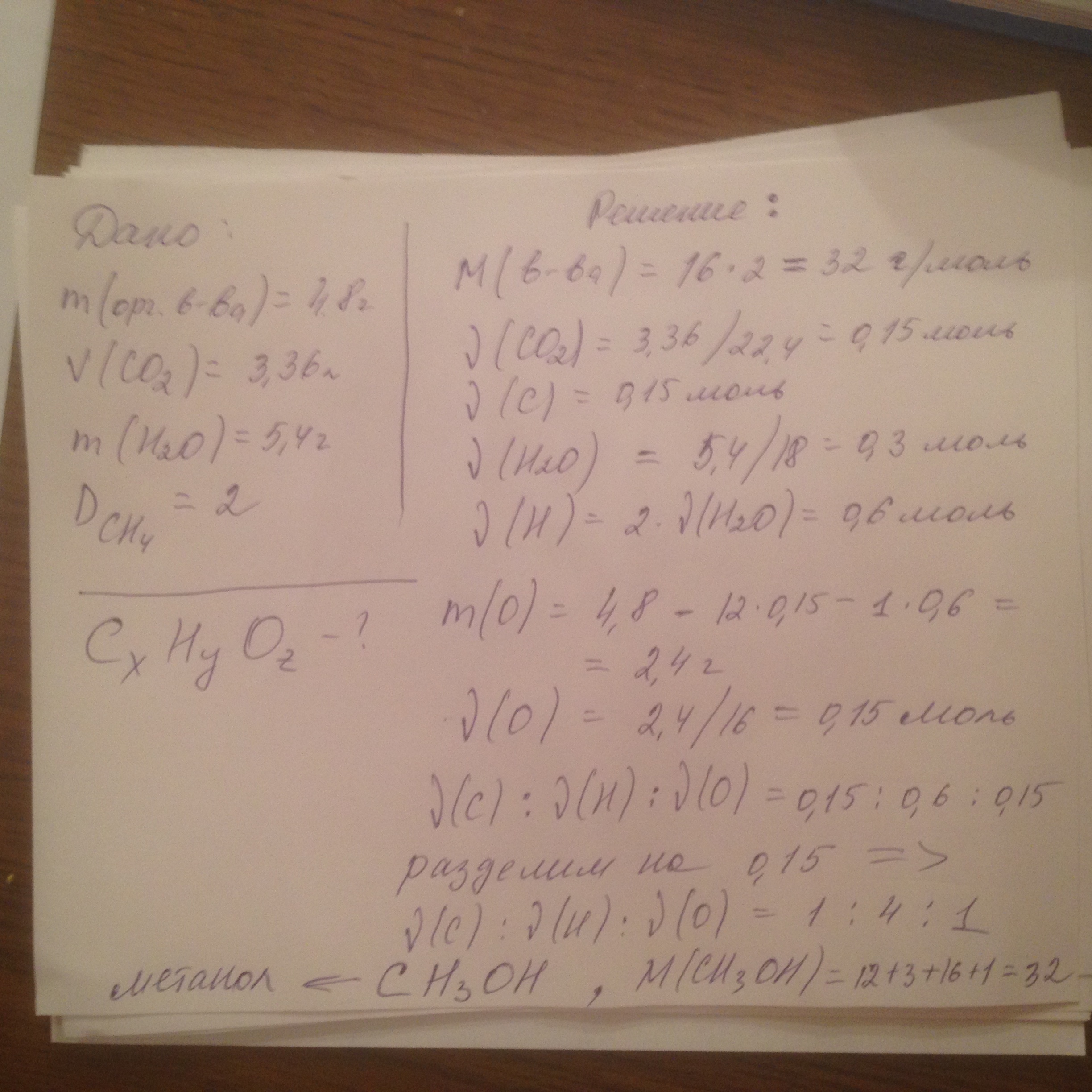 При сжигании 4,8г. органического вещ-ва образовалось 3,36 л оксида углерода(IV) и 5,4 г. воды. Плотность паров этого вещ-ва по метану 2. Определить формулу вещ-ва.
