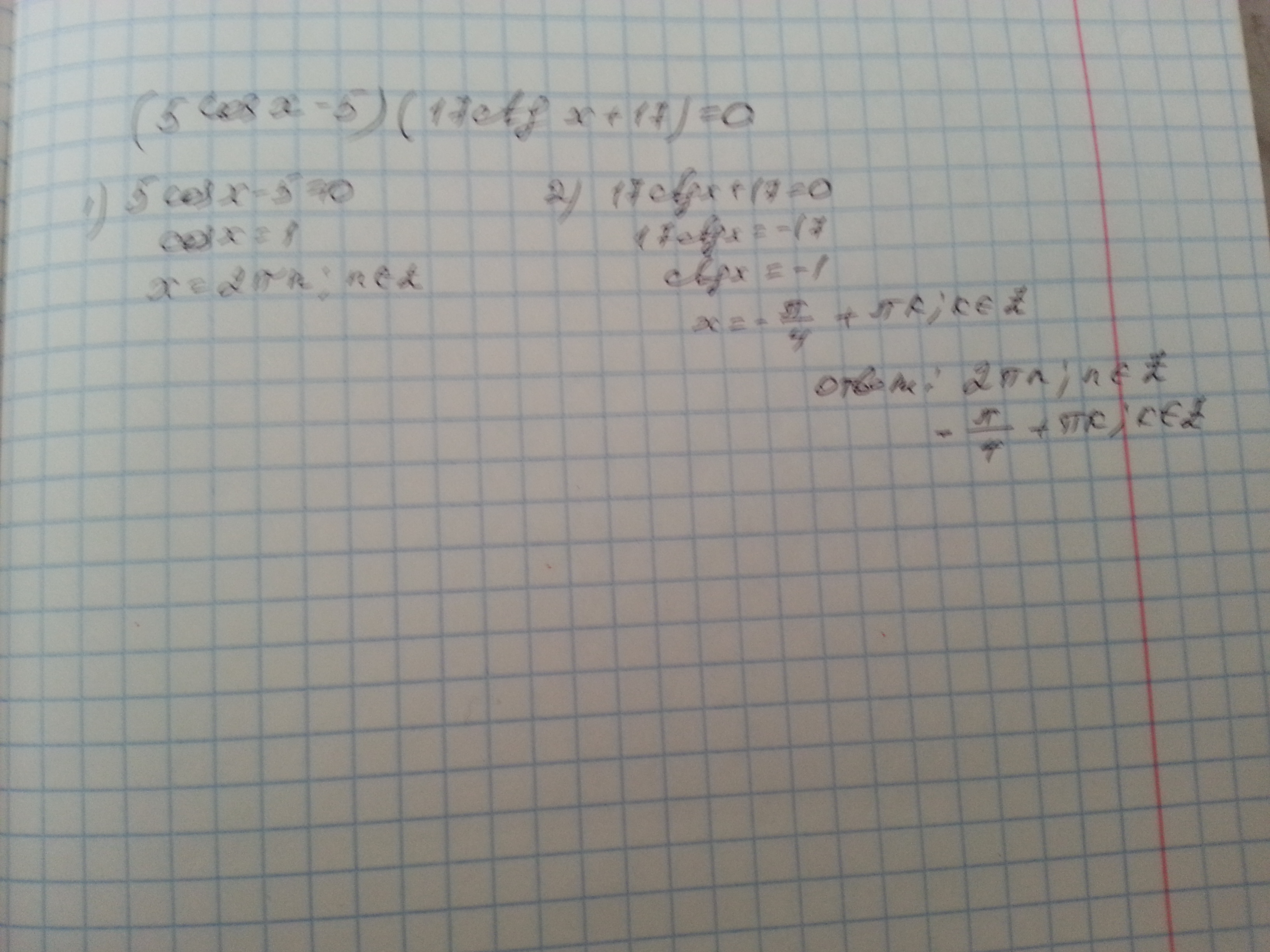 (5cos x - 5)(17ctg +17)=0