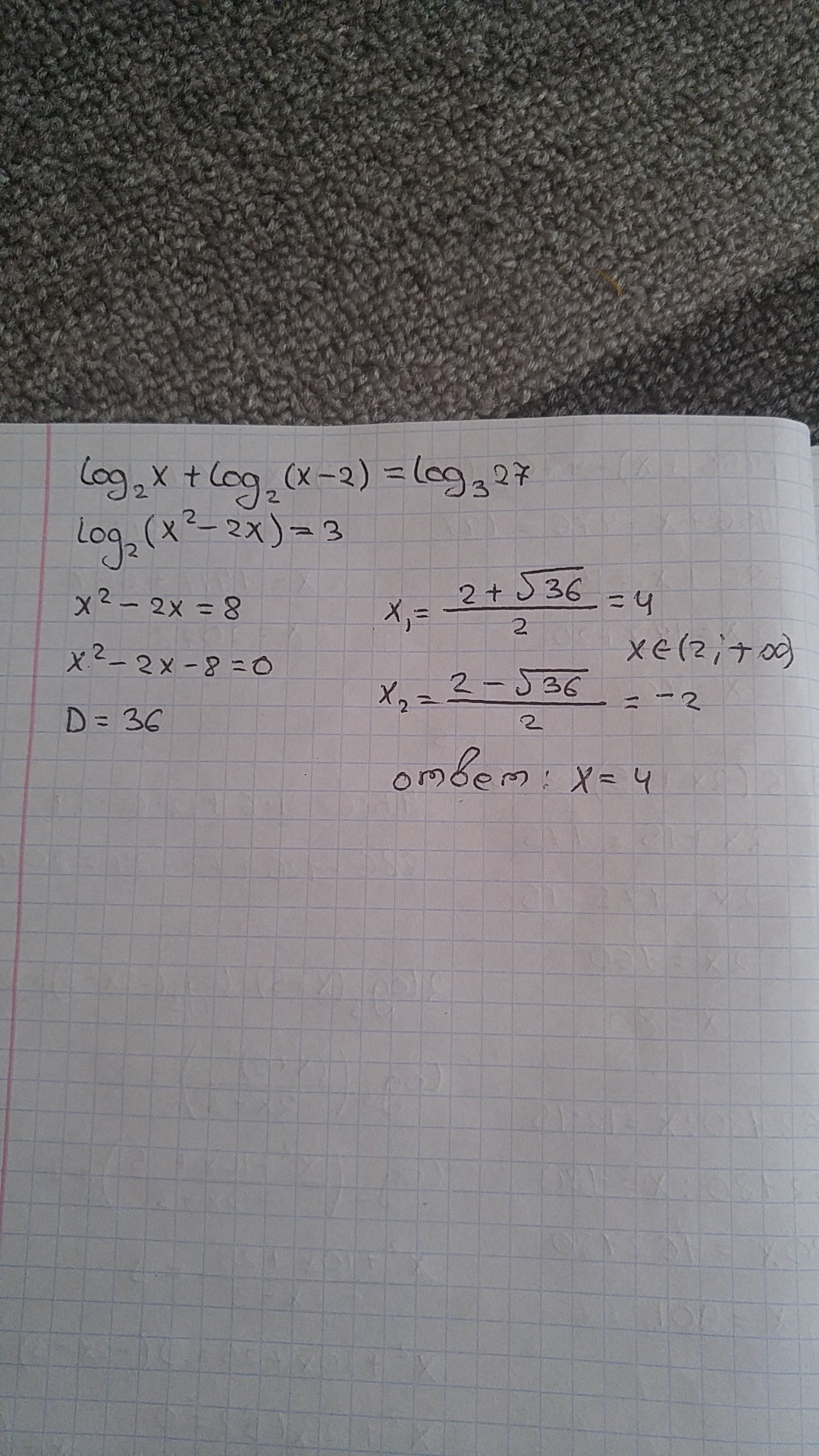 log₂x + log₂(x-2) = log₃27