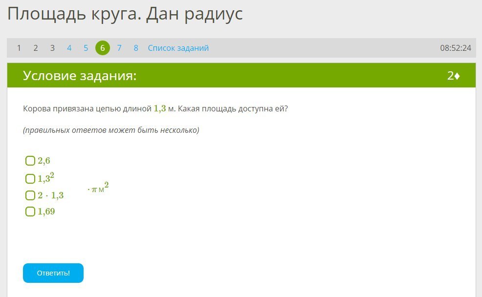 Корова привязана цепью длиной 1,3 м. Какая площадь доступна ей?