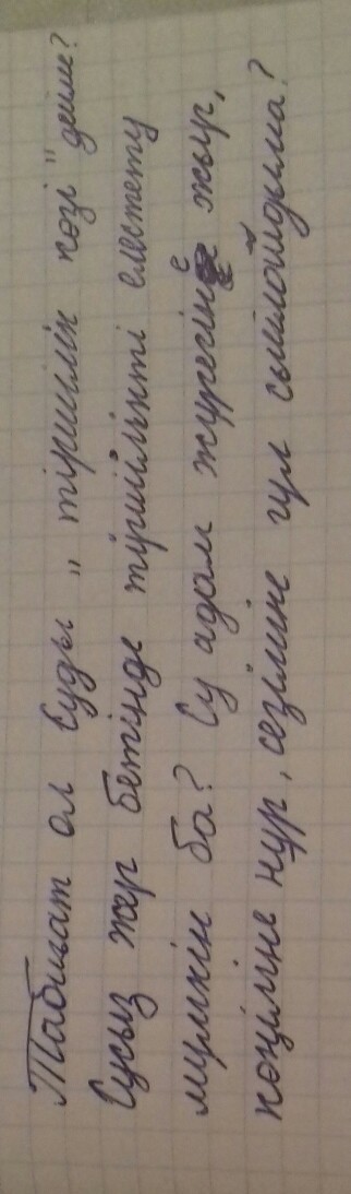 Помогите поставить в вопросительную форму предложения: Табиғат ол су.Суды "тіршілік көзі" дейді.Сусыз жер бетінде тіршілікті елестету мүмкін емес.Су адам жүрегіне жыр, көңіліне нұр, сезіміне гүл сыйлайды.