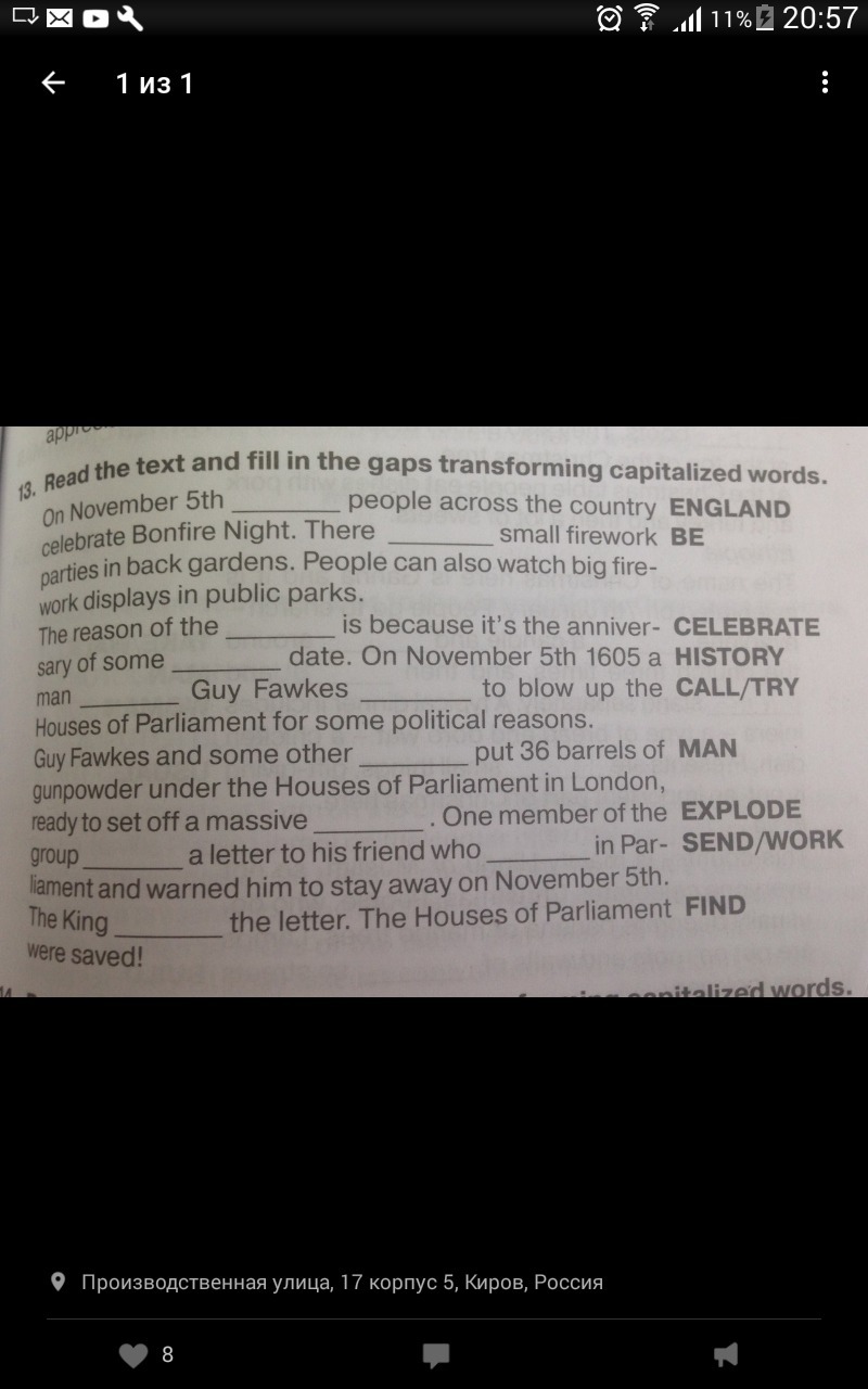 5 Ноября англичане по все стране отмечают Ночь Костра. В задних дворах справляют небольшие вечеринки с фейерверками. Люди так же могут наблюдать большие фейерверки в публичных парках. Причина этого праздника это годовщина одной исторической даты.