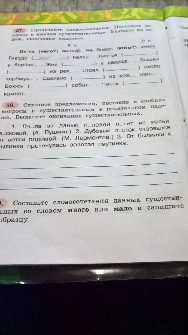 упр 57: Гнездо кого? Белки,Листья (у чего?) у березки,жил (у кого?) у дедушки,вышел (из чего?) из реки,стоял( около чего?) около черемухи,