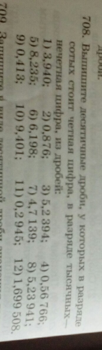 Помогите пж #708 выпишите десятичные дроби,у котооых в разряде сотых стоит чётная цифра,в разряде тысячных нечётная цифра,из дробей:
