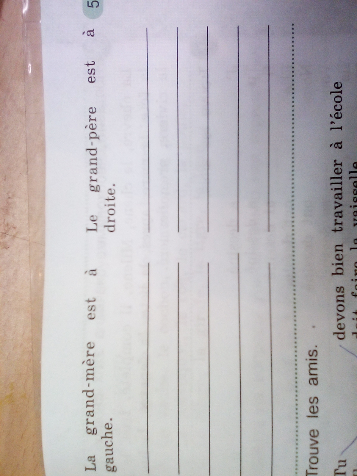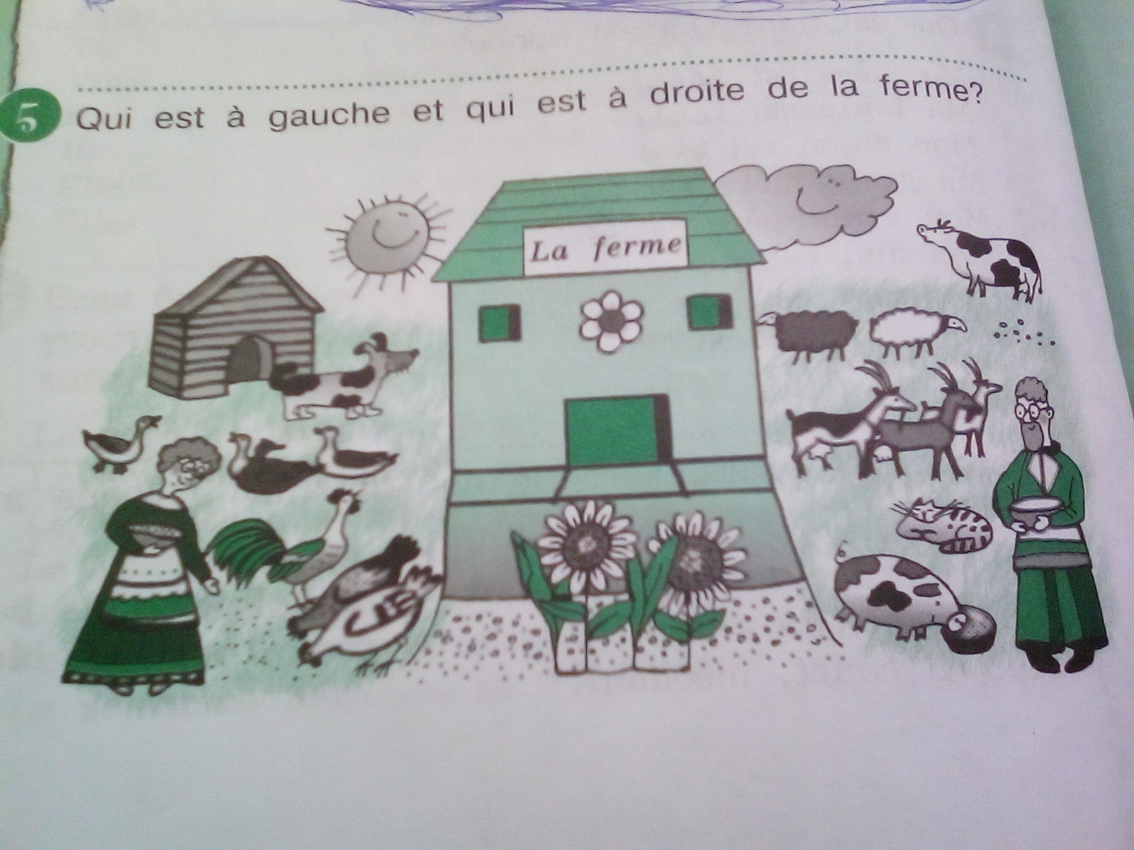 à gauche (слева): le soleil (солнце), la niche (конура), le chien (собака), les canards (утки), le coq (петух), les poules (куры), la grand-mère (бабушка).