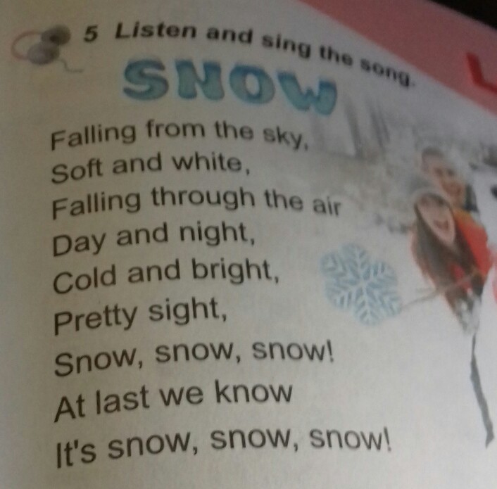 Переклад: сім'я з неба мякою і писати , падіння протягом дня і ночі повітря , холодне і яскраве , привабливий вигляд сніг ,сніг ,сніг !Нарештіими знаємо його сніг,сніг,сніг
