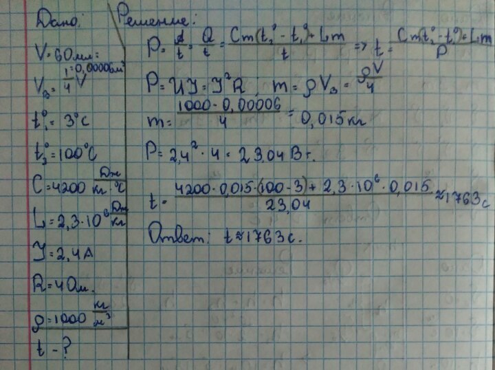 воду из мензурки перелили в стакан и 1/4 часть испарили. определить время, за которое происходило нагревание и испарение, пренебрегая потерями на нагревание стакана. на рисунке сила тока 2,4 А, сопротивление 4 Ом, объём 60 мл, температура 1 = 3, температура 2 = 100 это понятно. подскажите хотя бы формулу и как решать примерно.