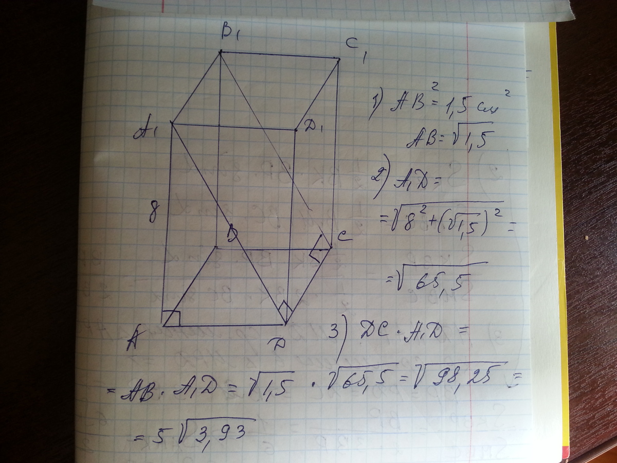 Площадь основания правильной призмы АВСDА1В1С1D1 равна 1,5 см2. Высота призмы равна 8 см. Найдите площадь сечения А1В1СD.