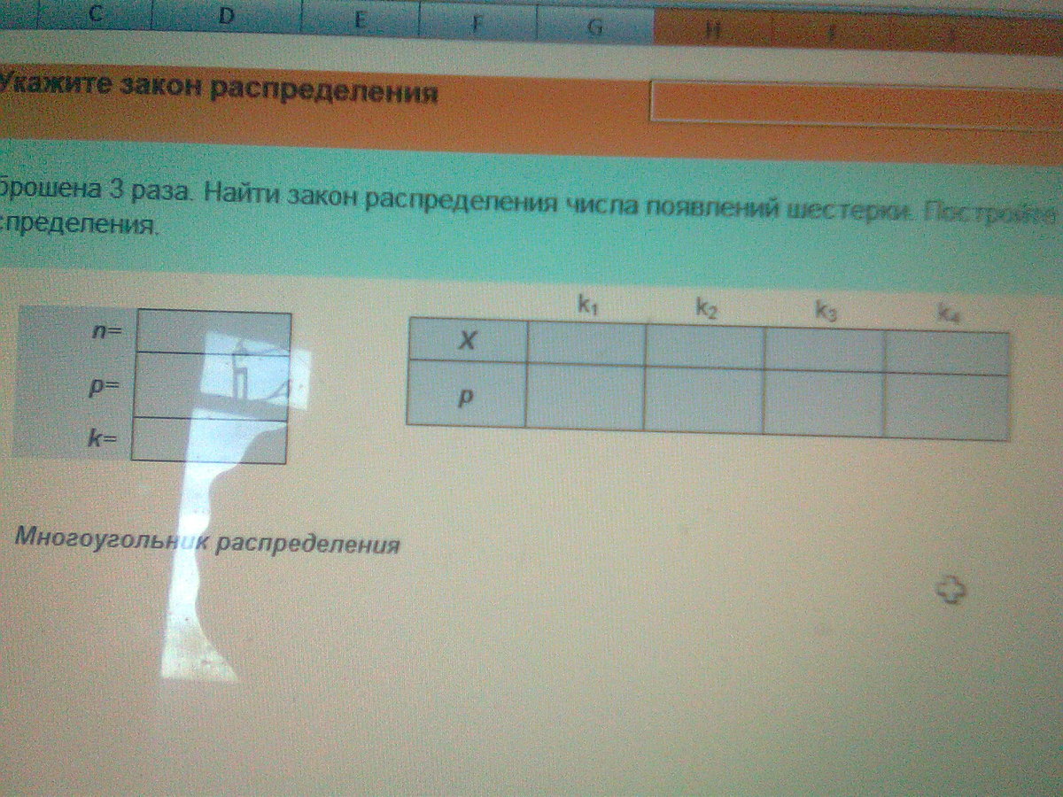 2)Игральная кость брошена 3 раза. найти закон распределения числа появления шестерки . Постройте многоугольник распредления