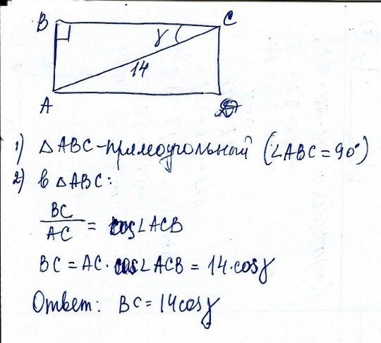 Диагонали прямоугольника ABCD равна 14, угол ACB равен y найти сторону BC