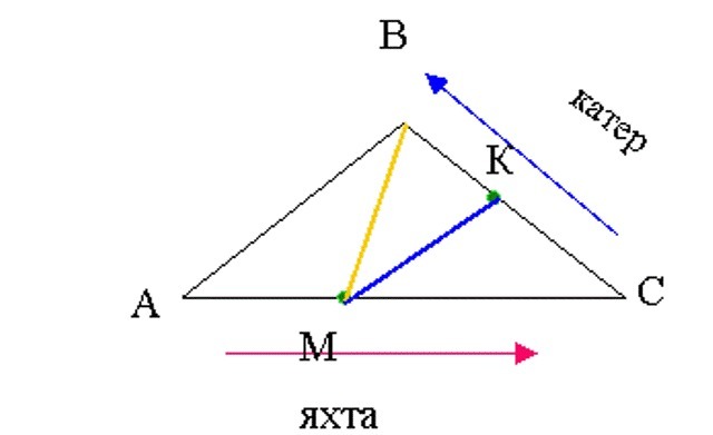 Яхта села на мель в точке М, поэтому будем искать расстояние ВМ, которое пройдёт спасательная лодка к яхте и расстояние КМ, которое пройдёт катер к яхте.