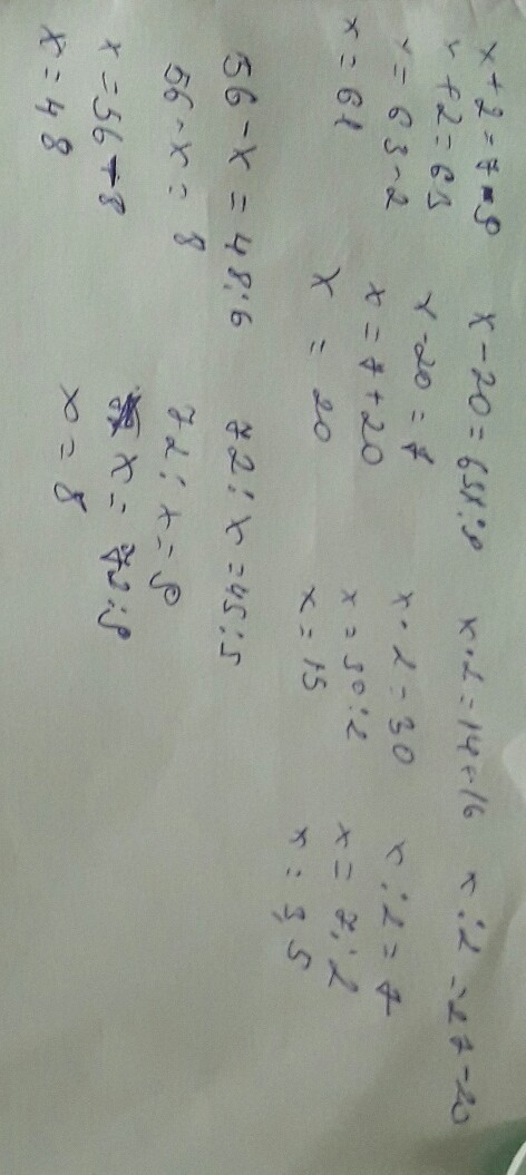 Х+2=7*9,Х-20=63/9,Х*2=14+16,Х/2=27-20,56-Х=48/6,72/Х=45/5