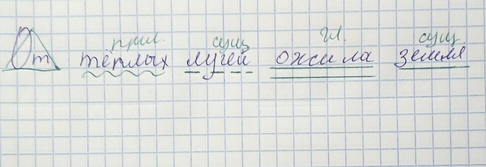 Земля подлежащее __, ожила сказуемое == , от тёплых определение ~~~, от лучей дополнение ----