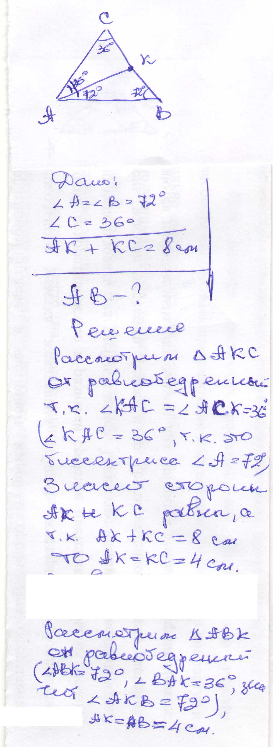 Градусные меры углов А, В и С треугольника ABC равны соответственно 72°, 72° и 36°. Сумма длин биссектрисы АК и отрезка КС равна 8 см. Найдите длину стороны АВ.