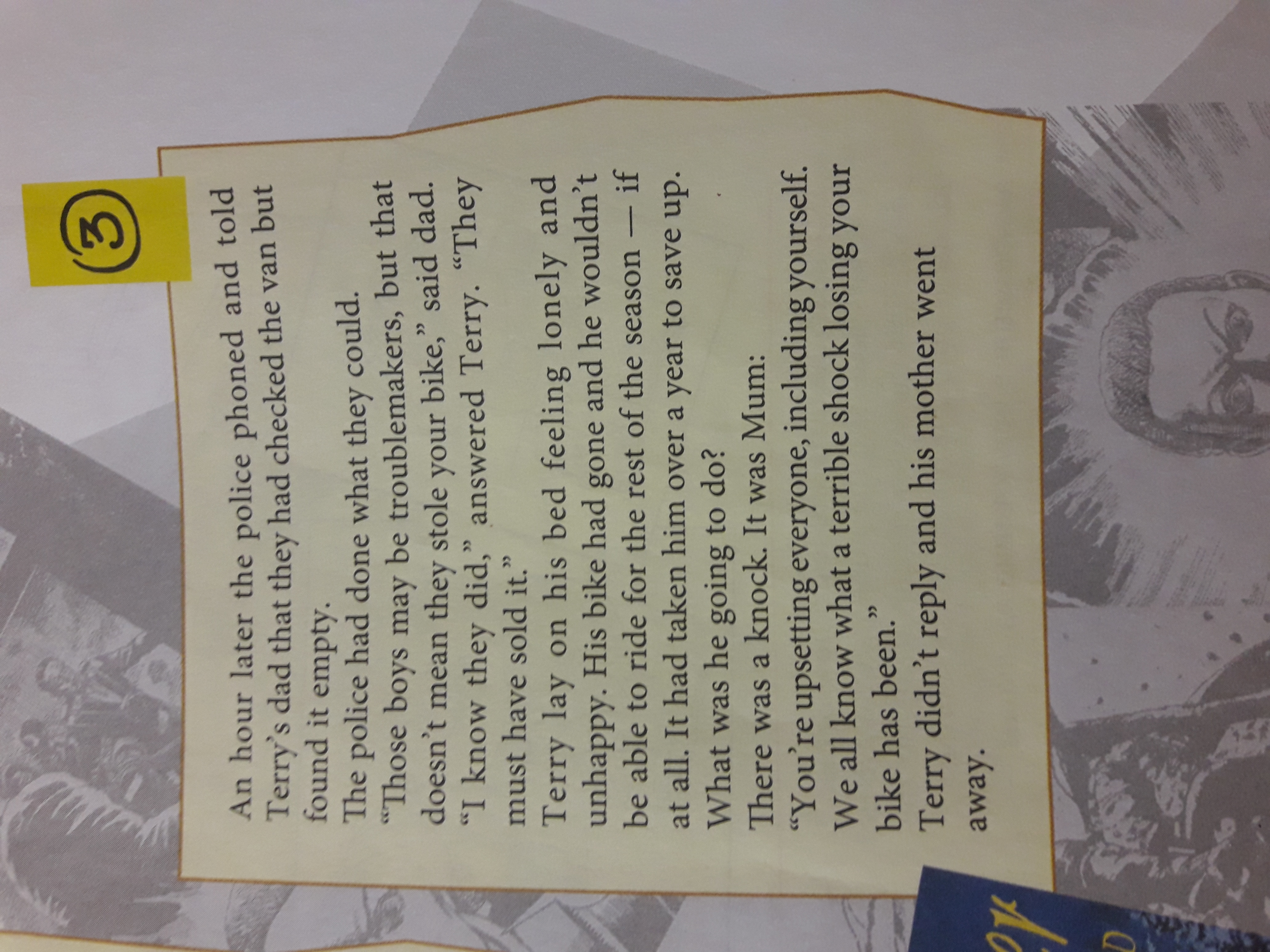 Час спустя в полицию позвонил и сказалОтец Терри, что они проверили Ваннашли его пустым.Полиция сделал все, что мог.У этих ребят может быть смутьянов, носказал папа.Т знаю, что они сделали, ответил Терри. #Онидолжно быть, продал его.Терри лежал на своей кровати одиноко инесчастным. Его велосипед ушел и он неуметь ездить на остаток сезонана всех. Ему потребовалось больше года, чтобы накопить.Что он собирался делать?Раздался стук. Это была мама:Вы расстраиваете всех, включая себя.Мы знаем, какой страшный удар потерятьвелосипедТерри не ответил, а его мать пошлапрочь.