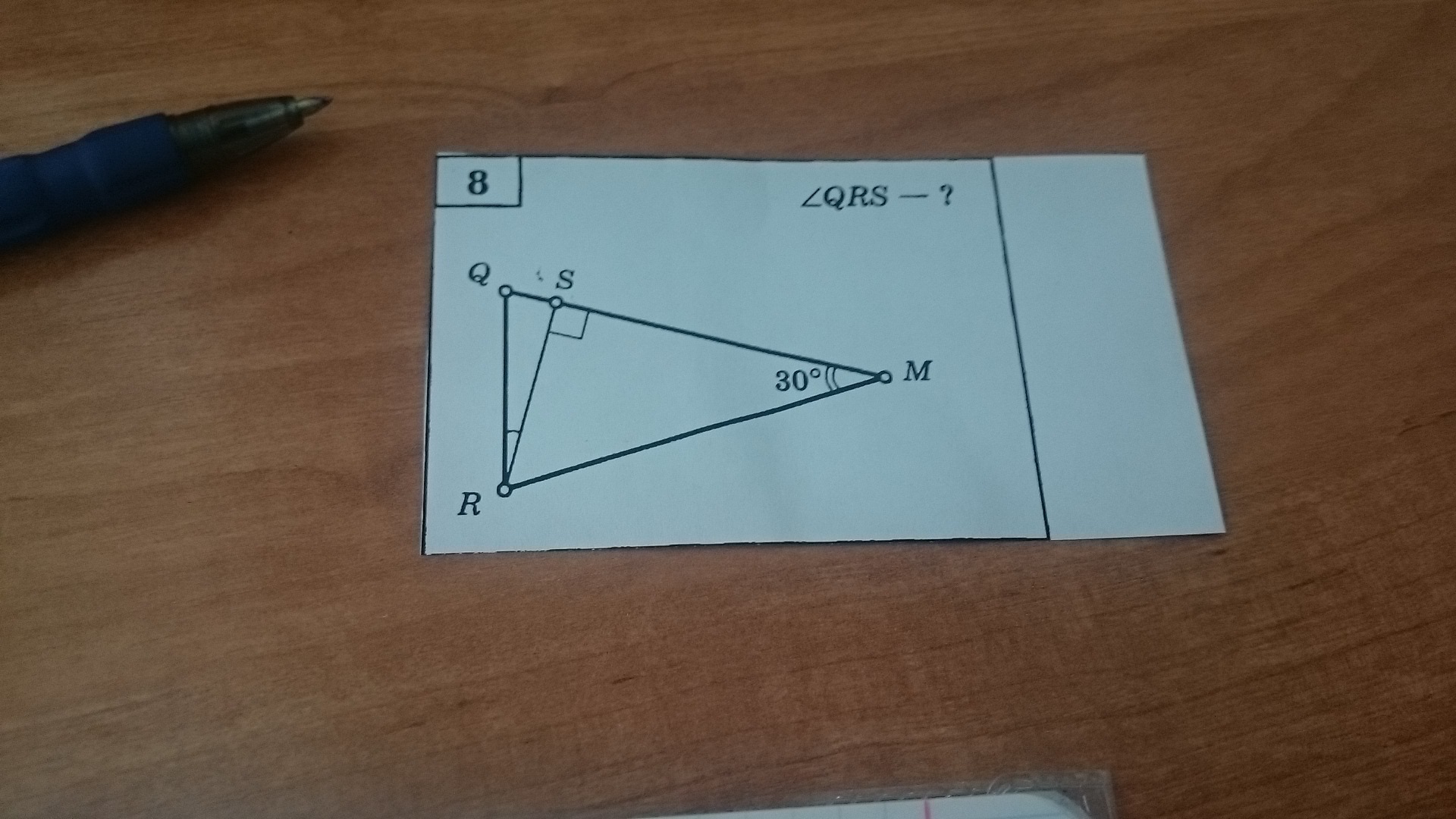Можно предположить,что треугольник равнобедренный, т. е. углы Q и R в его основании равны по 75°((180-30)/2).Тогда угол QRS равен 75°.
