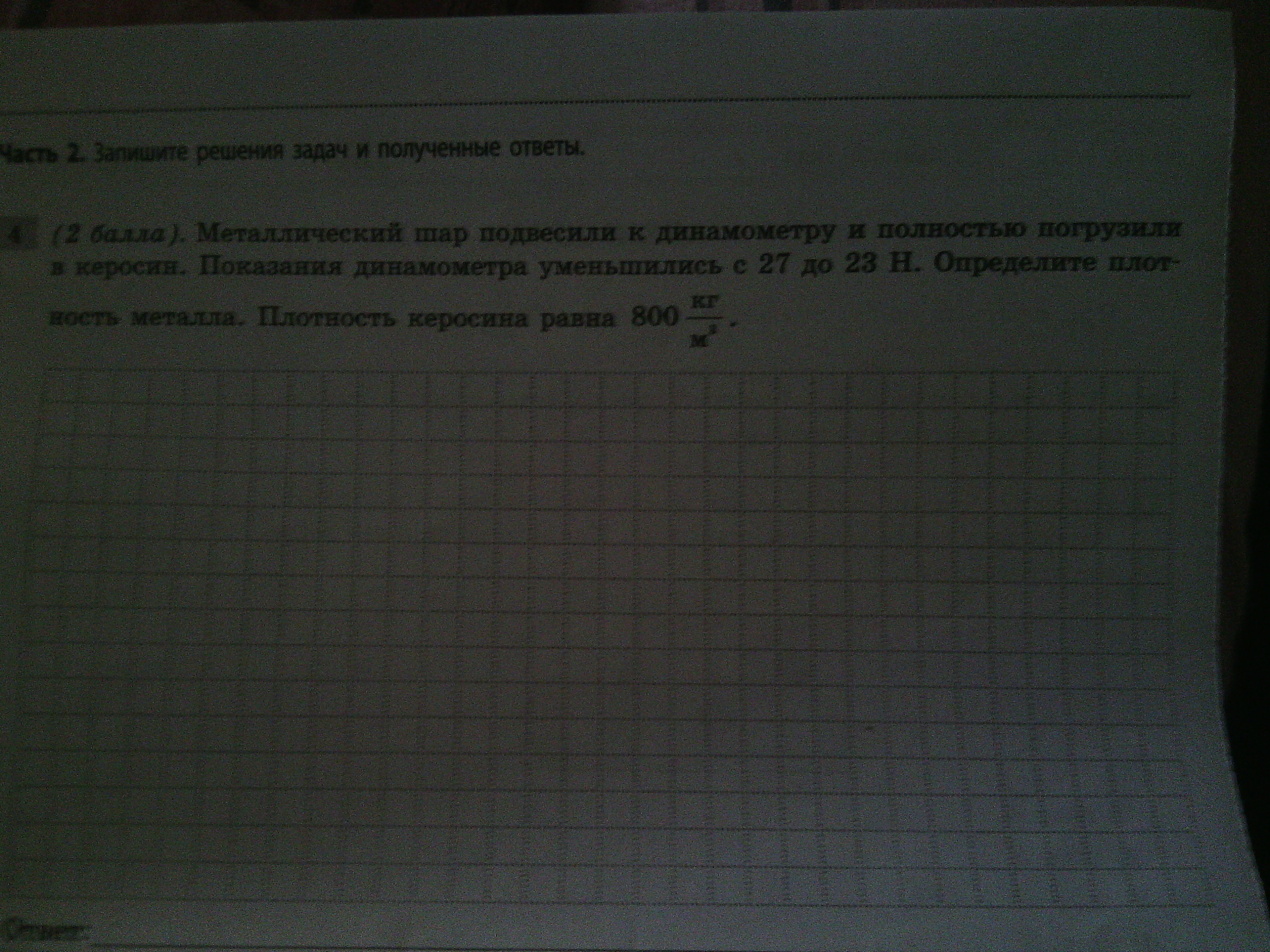 Из опыта видно, что керосин такого же объёма, что и шар, имеет вес P1=27-23=4 Н