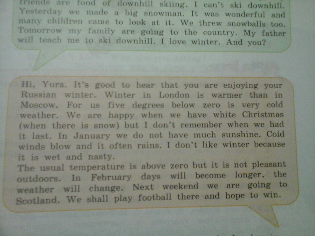 Привет, Джон. Сейчас снежно в Лондоне? Здесь идёт сильный снег, но довольно тепло.Температура пять градусов мороза. Обычно в январе в Москве намного холоднее. Школьные каникулы закончились, но я провожу много времени на открытом воздухе. Улицы Москвы очень красивые с снежинками, падающими на землю. Мы с друзьями ходим( я и мои друзья) кататься на коньках и на лыжах. Я люблю беговые лыжи, мои друзья любят горные лыжи. Я не умею кататься на горных лыжных. Вчера мы сделали большого снеговика, это было замечательно, и многие дети пришли, чтобы посмотреть на него. А ещё мы бросались снежками. Завтра моя семья поедет за город. Мой отец будет учить меня кататься на горных лыжах. Я люблю зиму. А вы?