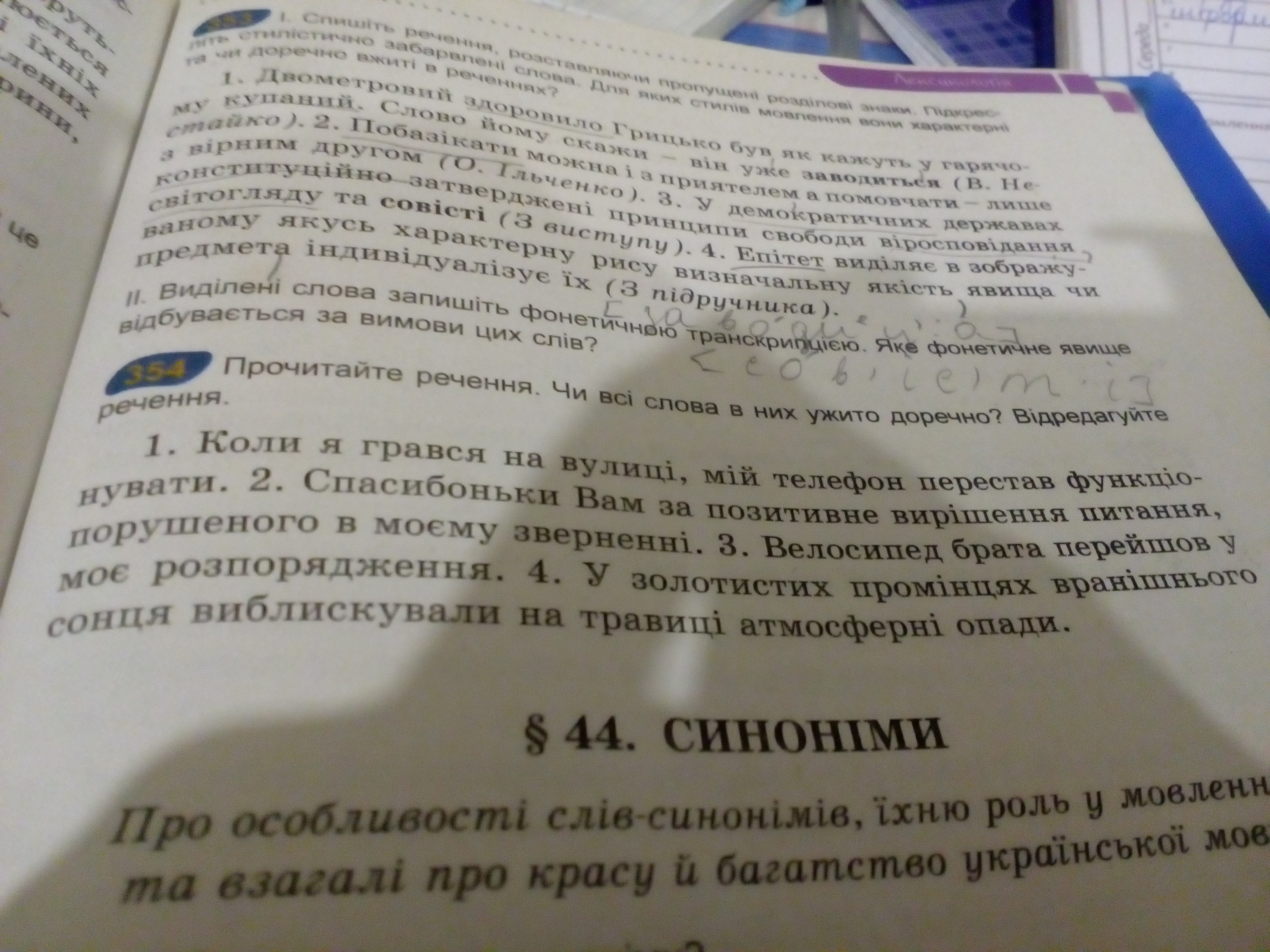 354. 1.Коли я грався на вулиці, мій телефон перестав працювати. 2 . Дякую Вам за позитивне вирішення питання , порушеного в моєму зверненні . 3 . Велосипед брата перейшов у мої руки 4. У золотистих промінцях вранішнього сонця виблискували на травиці крапельки роси .