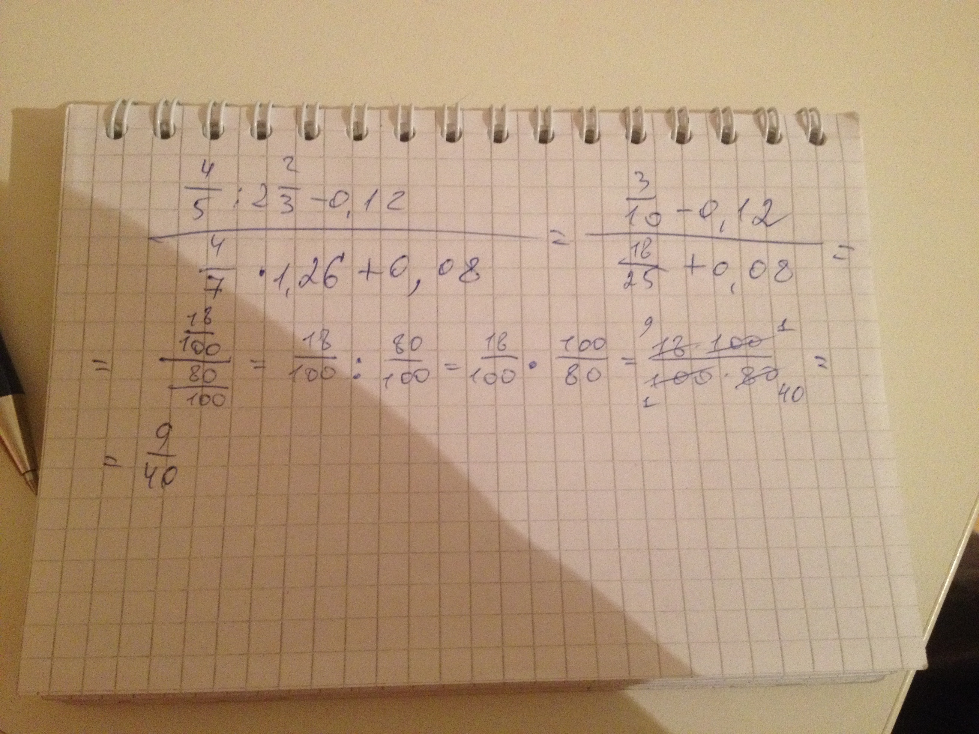 вычислите 4/5:2 2/3-0.12 дробная черта 4/7*1.26+0.08