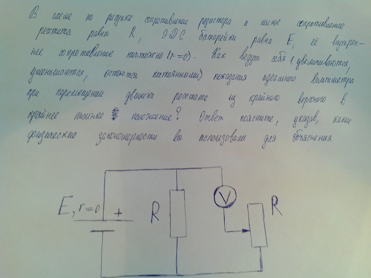 2) Если вольтметр "НЕидеальный" (его внутреннее сопротивление имеет конечную величину), тогда напряжение на нем и потенциометре будут распределяться пропорционально их сопротивлениям (так как ток через вольтметр и потенциометр течет один и тот же) - в крайнем верхнем положении вольтметре покажет наименьшее напряжение (ЭДС минус напряжение на потенциометре) , а в крайнем нижнем - наибольшее (в этой задаче равное ЭДС)