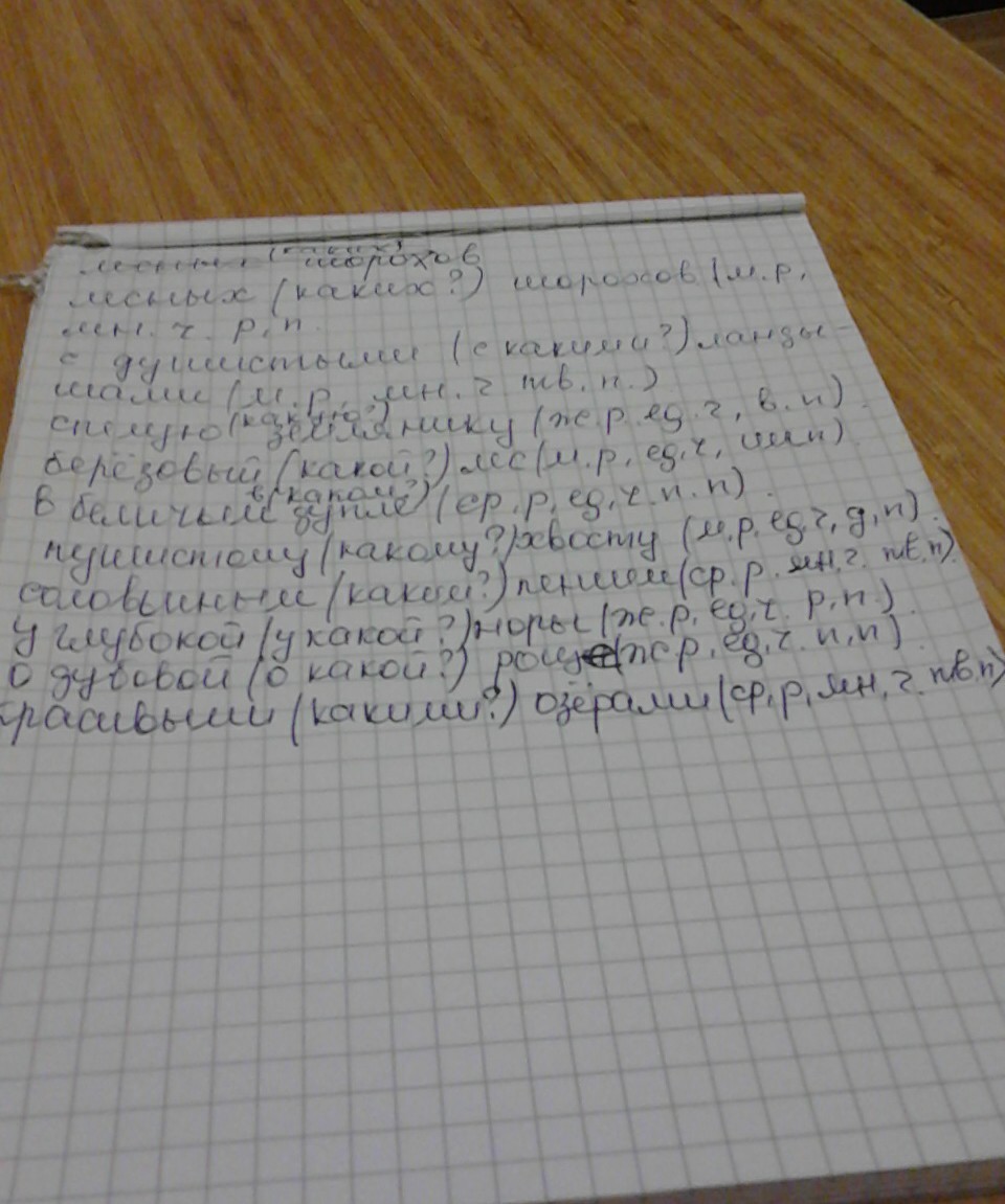Запиши словосочетание.Обозначь окончание имён существительных и прилагательных.Определи род,число и падеж,существительных и прилагательных образец утреннюю(какую) зарядку-ж.р,ед.ч.,В.п.. Лесных шорохов, (с) душистыми ландышами,спелую землянику,берёзовый лес,(в) беличьем дупле,пушистому хвосту,соловьиным пением,(у) глубокой норы,(о) дубовой роще,красивыми озёрами. НЕ ПЛАГИАТ
