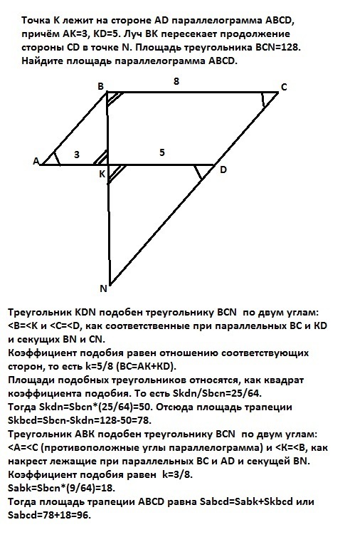 Точка K лежит на стороне AD параллелограмма ABCD, причём AK=3, KD=5. Луч BK пересекает продолжение стороны CD в точке N. Площадь треугольника BCN=128. Найдите площадь параллелограмма ABCD.
